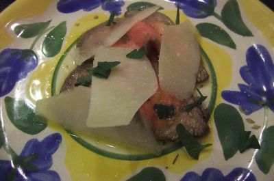 ローストビーフと薄切りのパルミジャーノと一緒にいただきます。