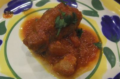 燻製チーズと生ハムの牛ロールトマト煮込みです。