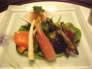 マス、姫竹、ししとう、みょうがの酢漬け、南瓜、稚鮎、