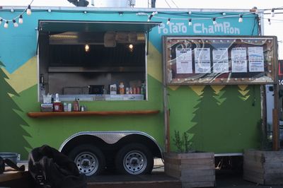 角地にある敷地に何店舗かフードトラックが集まっている